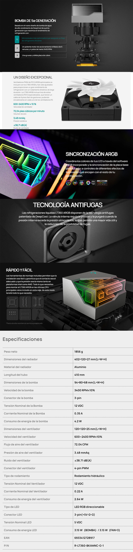 El LT360 ARGB es una refrigeración líquida de CPU de alto rendimiento, mejorada con la bomba de 5ª generación más puntera de DeepCool, y proporciona una gran potencia de disipación con un radiador de 360 mm, tres ventiladores FD12 ARGB de precisión, y una tapa superior multidimensional infinita, todo presentado en un diseño limpio.