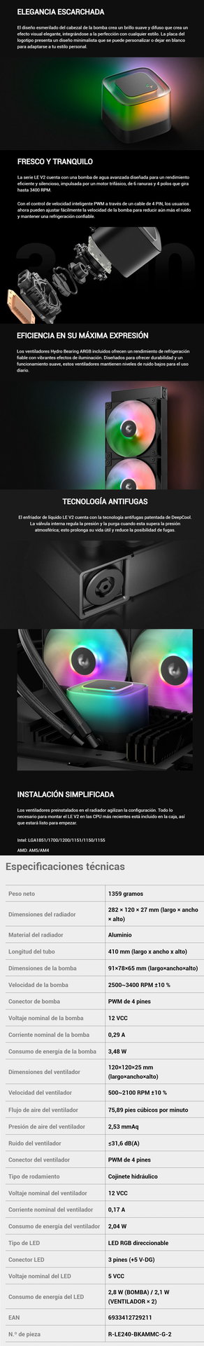 DeepCool LE240 V2 ARGB Black Water Cooling 240mm Negro Intel & AMD Lga 1857 AMD AM5